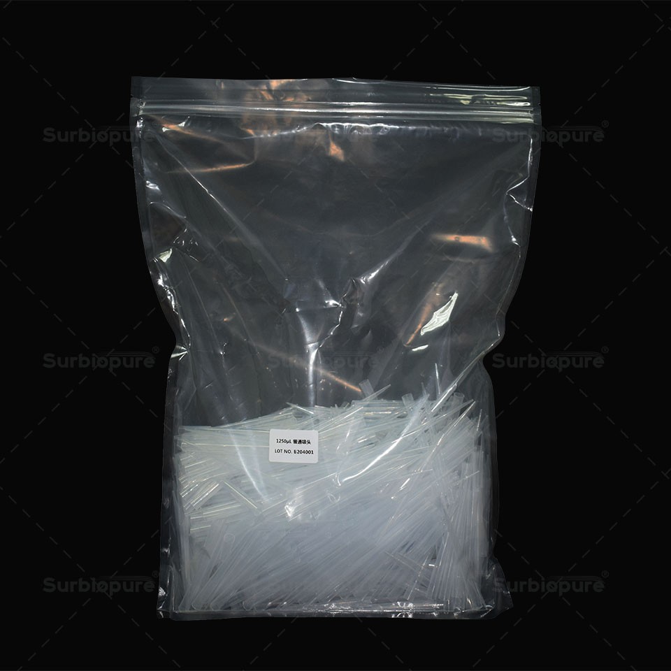 產品名稱:1250uL 透明普長吸頭,袋裝,無菌,無酶